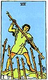 The figure on the Seven of Wands appears to be in a battle. He's either attacking or under attack, probably both. When we decide to take a stand, we set in motion an energy of resistance. When we take up a firm position, others do the same. The Seven of Wands stands for aggression and defiance because they are two sides of the same coin. You attack; your opponent defends. He counterattacks; you defend.